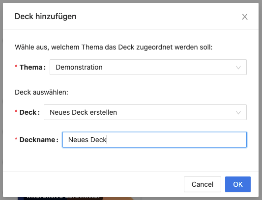 If you would like to add cards to a new deck, you can click on the deck name button and then click add.